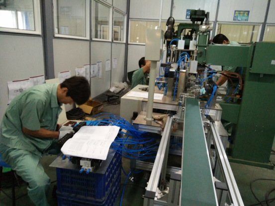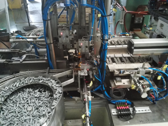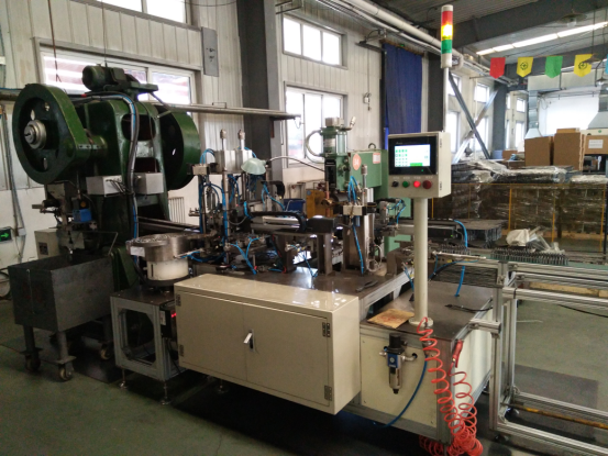 將M、U型直線原料沖壓成型、套帽、焊接、二次成型、25件分組整理后傳送至出料傳送帶. |